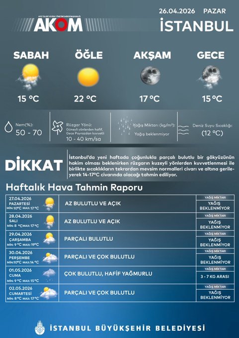 AKOM’un “Dikkat” notuna göre İstanbul’da yeni haftada parçalı bulutlu hava etkili olacak. Kuzeyli yönlerden esecek rüzgarla birlikte sıcaklıkların yeniden düşerek mevsim normalleri civarına, yer yer altına ineceği ve 14-17°C aralığında seyredeceği öngörülüyor.